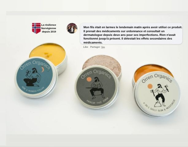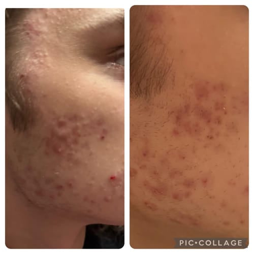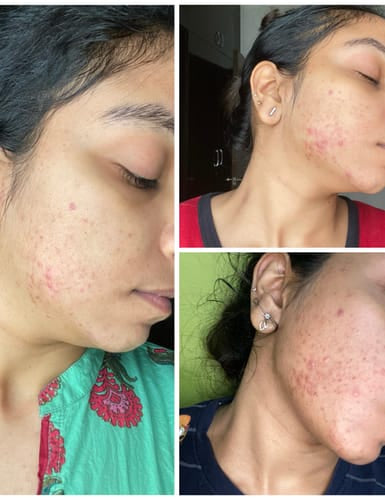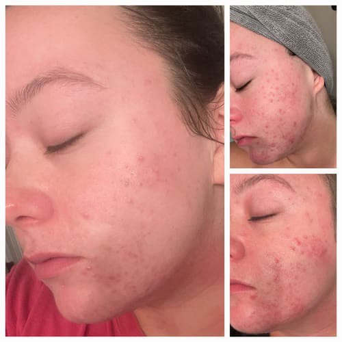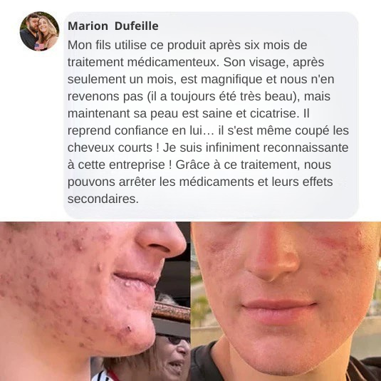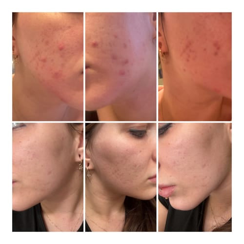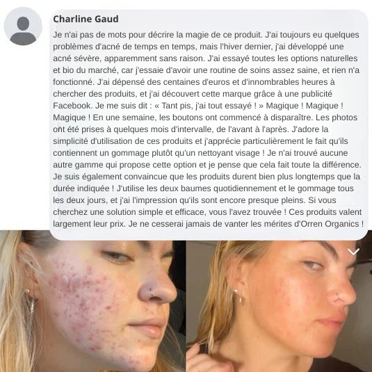"Je tenais à vous dire à quel point vos produits ont aidé ma fille, et ce dès la première semaine ! Je suis ravie que nous prenions des photos pour montrer les progrès ! Ma fille a des cicatrices d'acné très douloureuses et votre rituel contribue vraiment à les atténuer. Il a encore parfois un petit bouton, mais ils sont vraiment minuscules et disparaissent en un jour ou deux. Nous sommes enchantés des progrès réalisés jusqu'à présent. Merci beaucoup !"
